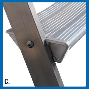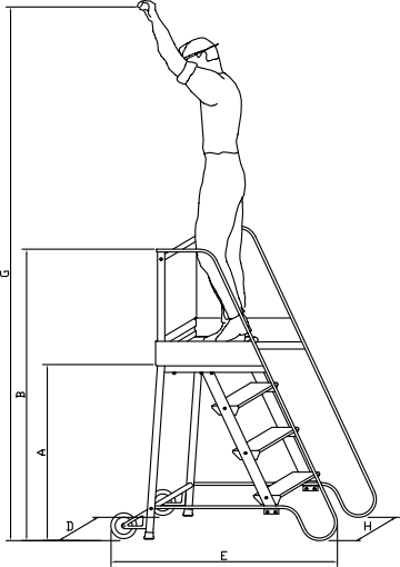Dans cette version, l’escabeau se déplace simplement en le poussant et se bloque avec le poids de l’opérateur.